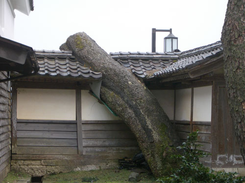切断された大木は塀に食い込み、