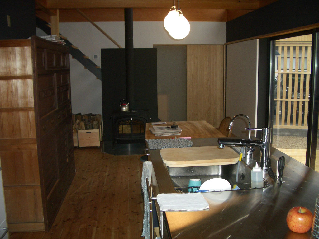 ストーブを中心とした間取りは、家族の語らいの時間を増やし、密度を高めてくれている。リビングの引き戸を開ければ、縦横につながる空間。キッチンと薪ストーブを中心とした間取りは、広いワンルームのよう。キッチンに立っていても、2階で洗濯物を干していても、常に家族の気配を感じる。気がついたのは、音がよく通ることだ。小さな声でもよく響くので、内緒話をするときは要注意である。