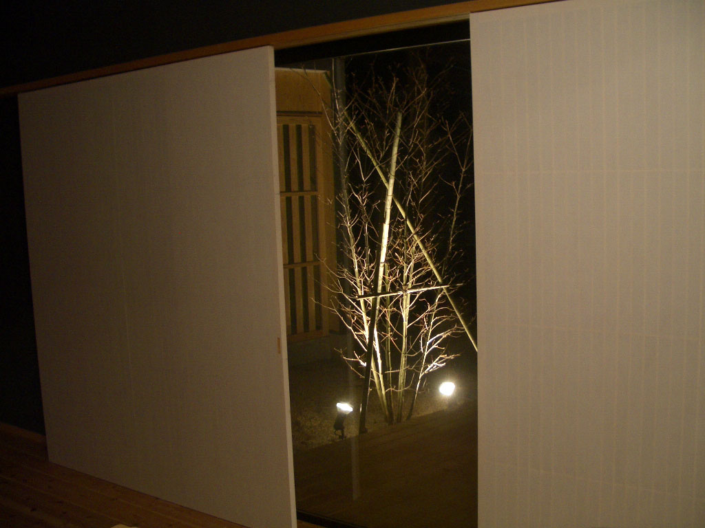 至るところにドラマティックな演出が凝らされています。そのうちのひとつが中庭の樹木のライトアップ。夕飯の支度をするとき、障子戸の隙間から眺めて愉しんでいます。枝が照明を受けて華やかで幻想的な光景を見せてくれます。どこかの温泉宿(こればっかり言ってますが)にでも滞在しているような、非日常気分を味わうことができるのです。