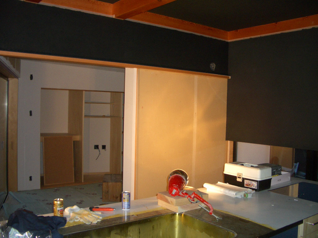 右側、設備機器の箱が置かれている後方に、水屋箪笥を置きます。