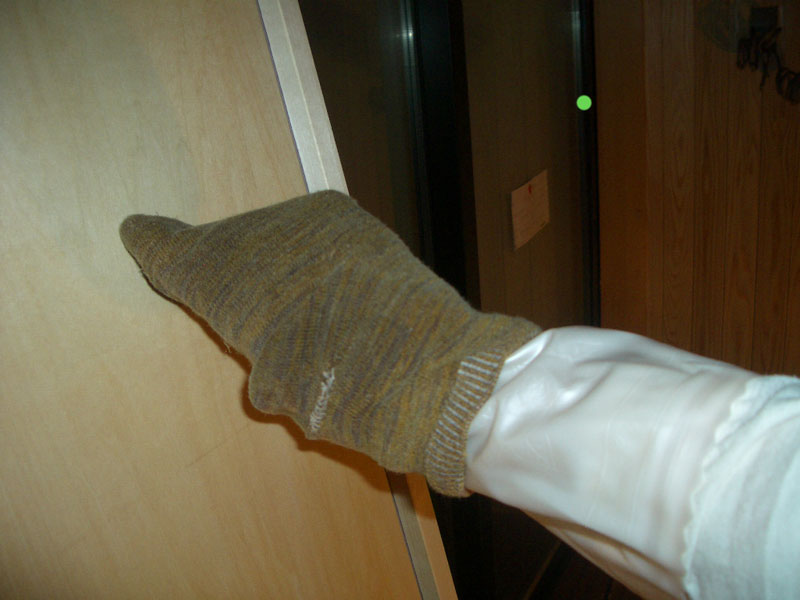 古靴下をゴム手袋の上からはめて塗ると、指先まで使えてすこぶる勝手がよい。