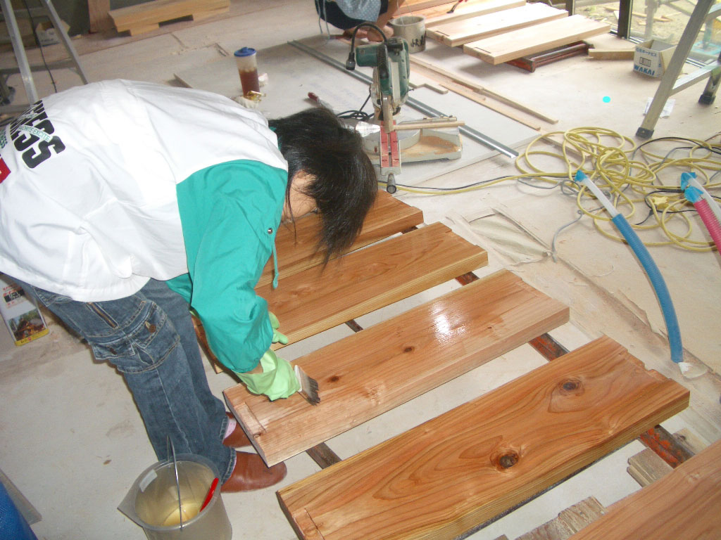 そんなやりとりをして、さてどこから塗ろうかと思っていたそのとき、建築家氏登場。塗った箇所を見てもらいオットと同様の指摘を受ける。で、塗り方の手ほどきを受け、何でもかんでも塗ればいいものではないことを、知る。薄くムラなく丁寧に。刷毛使いがポイントですね~。余分な塗料を切って、刷毛に含んだ塗料をゆっくりと木に染み込ませていく。
