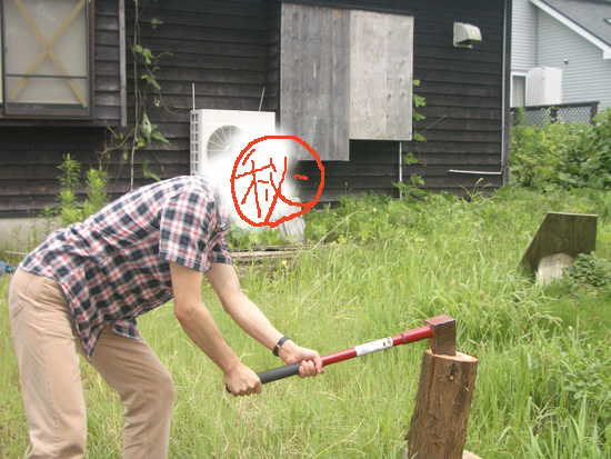 よう。慢性運動不足のオットが、薪割りで